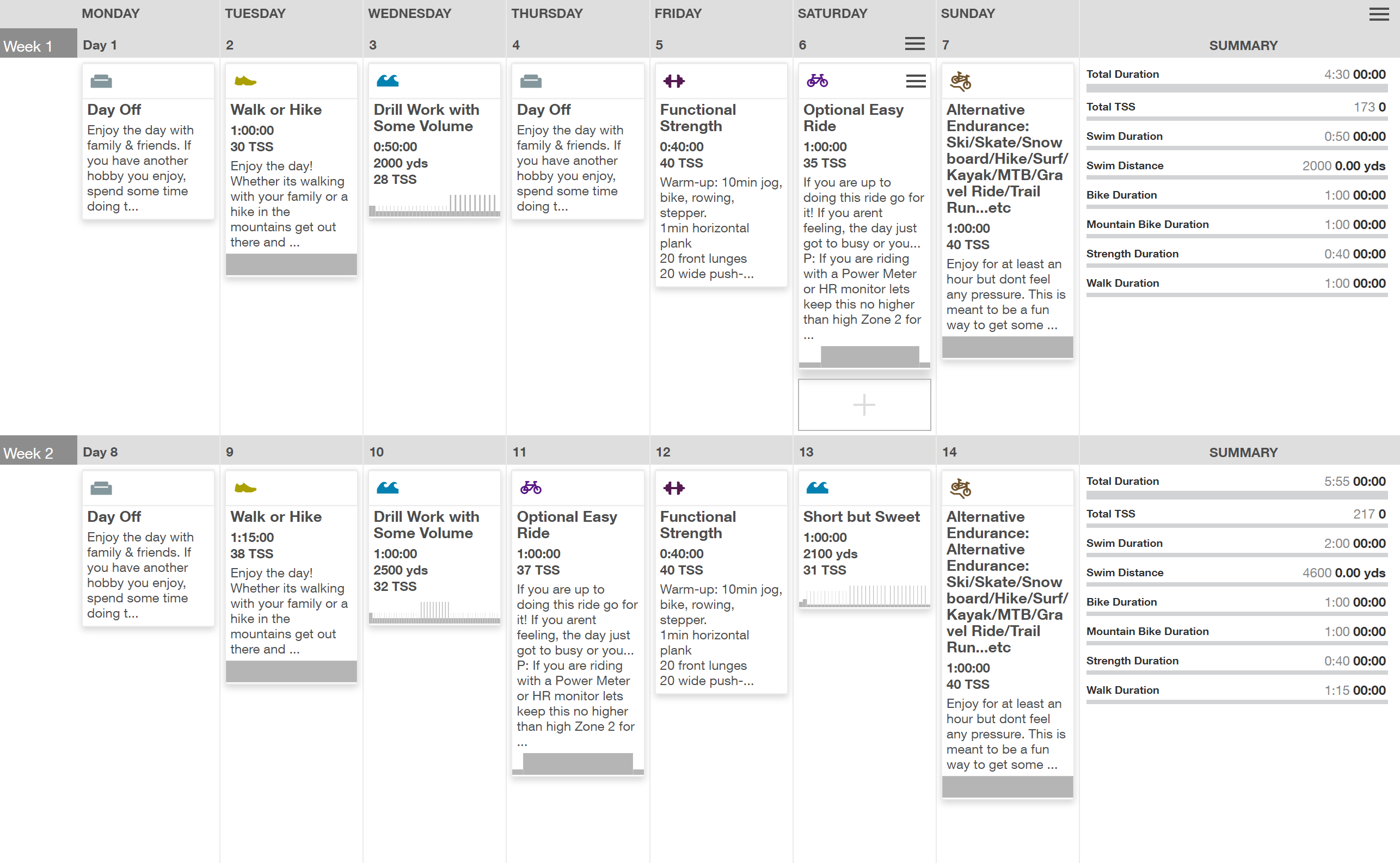 This plan offers you a smart, versatile and progressive transition to set a solid foundation for a successful 2021 season. The transition period is about preparing you for the specific training of the main season. It starts after the "off" period of 3-4 weeks, so the training begins easy, but progresses weekly.
